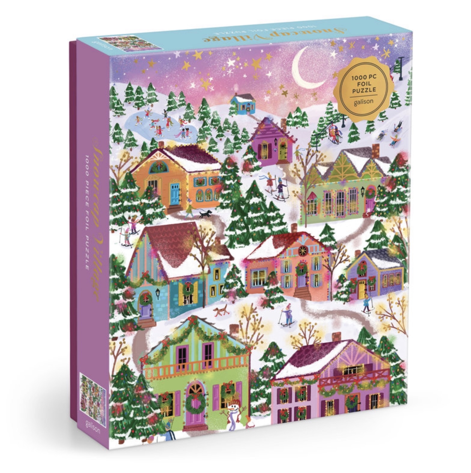 PUZZLE DE 1000 PIÈCES - Le puzzle de 1000 pièces « Village enneigé » de Joy Laforme, édité par Galison, représente un village enneigé et ses chalets qui se préparent pour les fêtes de fin d'année. Ce puzzle offre un niveau de difficulté idéal pour des heures de divertissement en famille ! La boîte contient une image du puzzle complet.