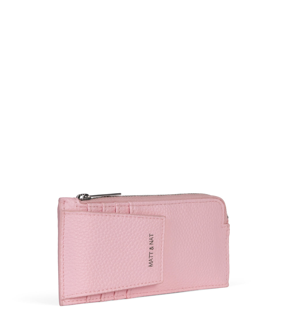 Porte-cartes avec une poche zippée pour la monnaie, 4 fentes pour cartes avec un rabat à bouton pression, et une poche fente à l’arrière à l’extérieur.
